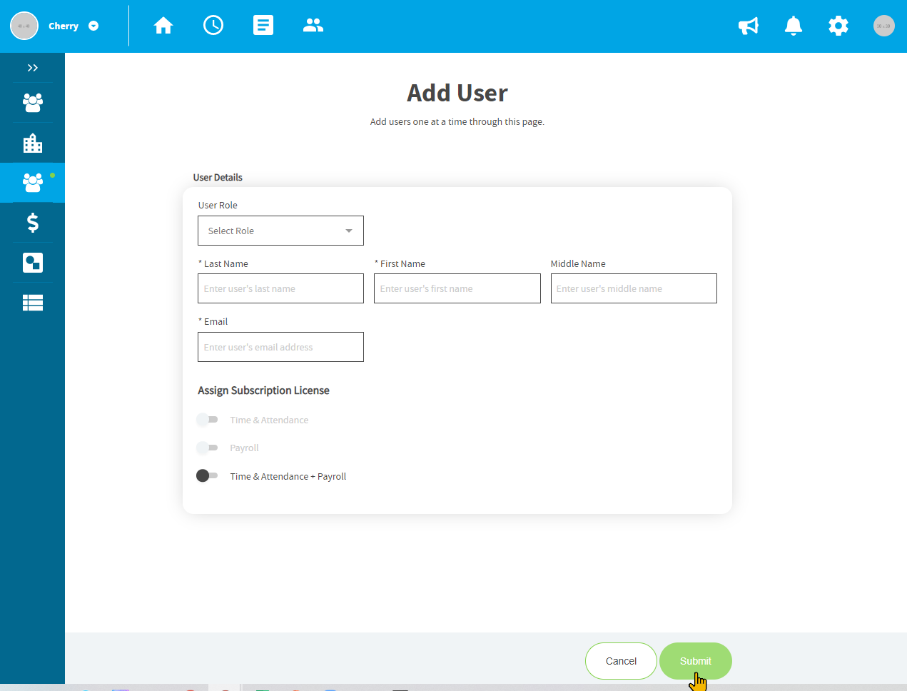 6. Click on Submit to finalize assigning a user to the newly added user.