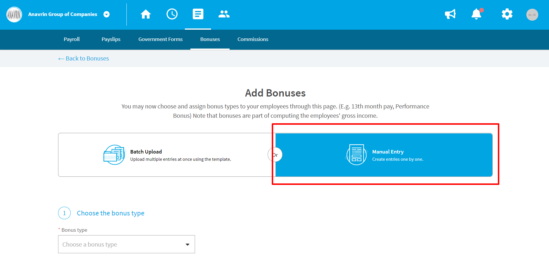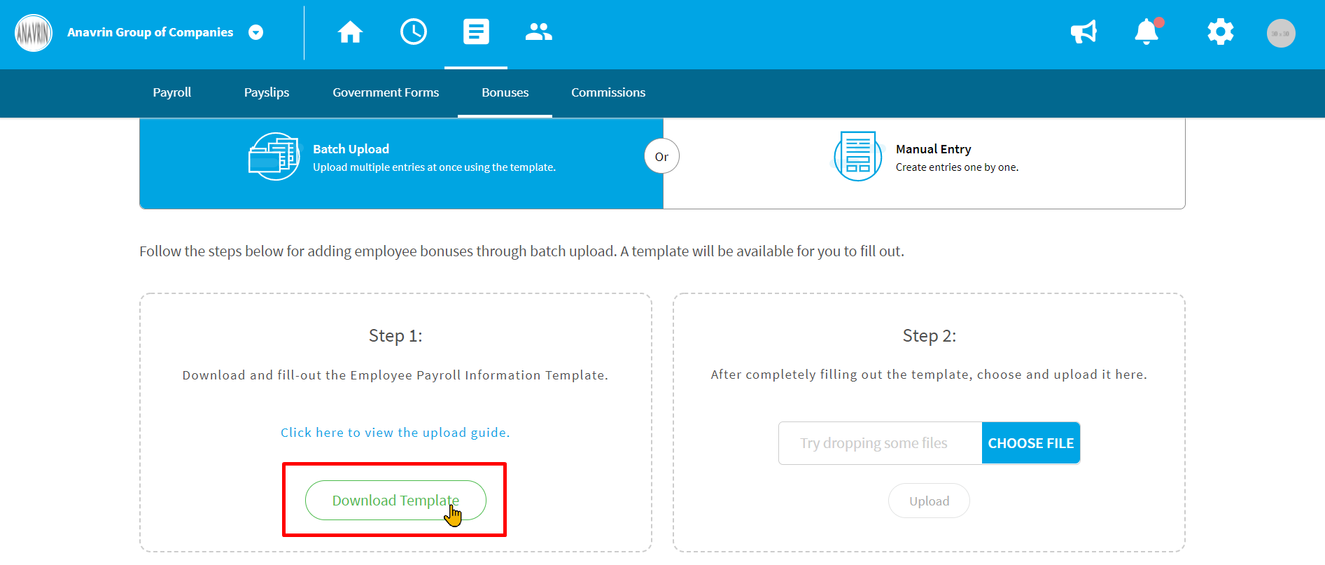 Selecting this method allows you to upload multiple entries all at once with the help of a Batch Upload template. You can also include bonuses that fall under another bonus type.