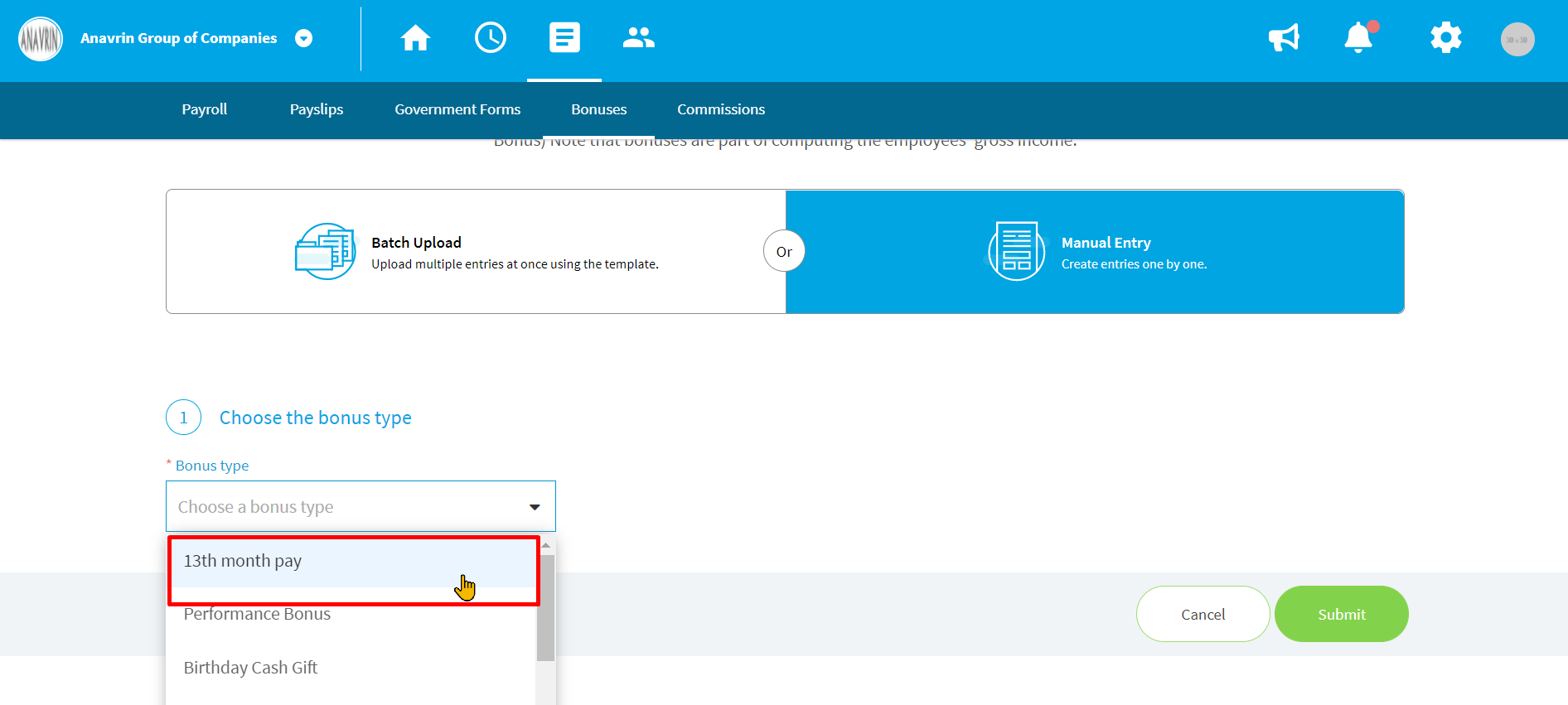 Adding 13th Month Pay on a Regular Payroll Run allows you to include the amount to be released as 13th Month Pay together with the employee’s Net Pay on the particular selected cut-off date. You can add employees' 13th Month Pay as a bonus item via Manual Entry or Batch Upload.