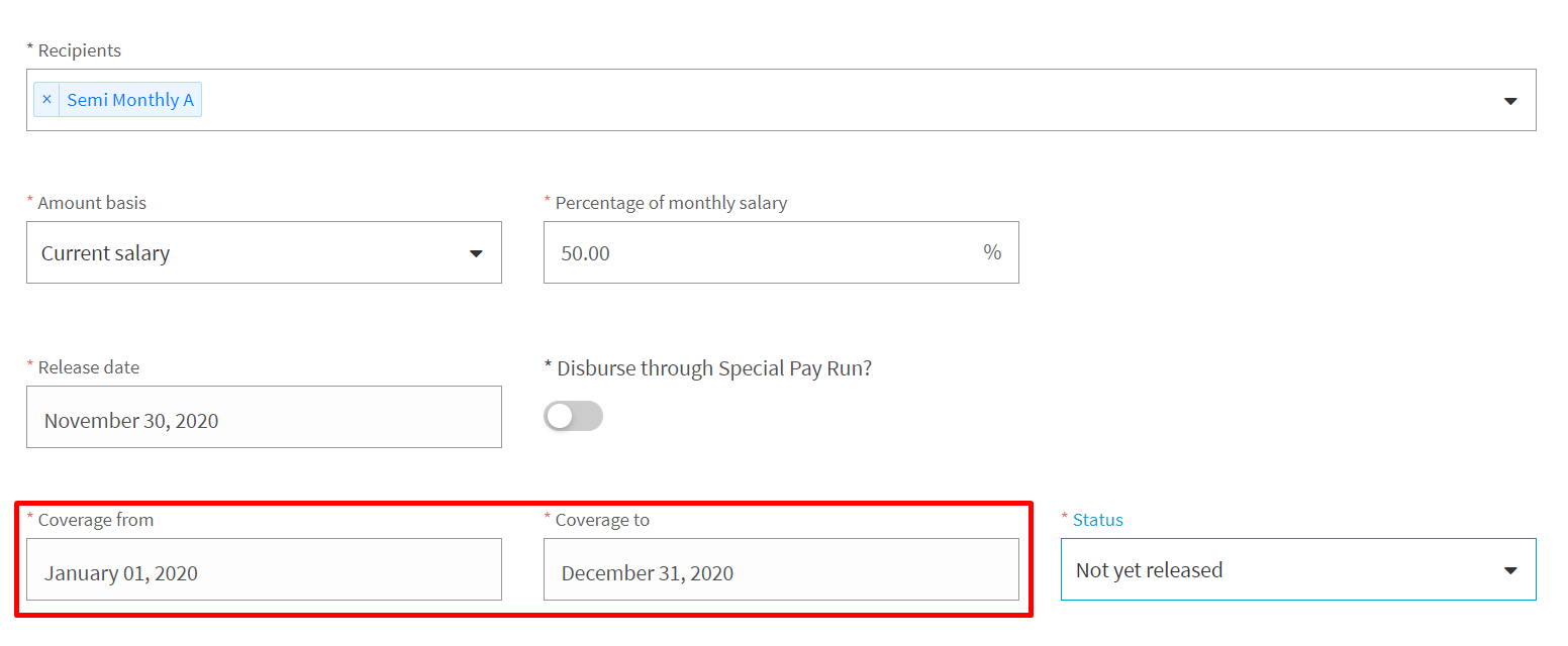 This refers to the attendance date range to be considered as the basis for employees' 13th Month Pay Computation. This field appears when the selected bonus type is salary-based.