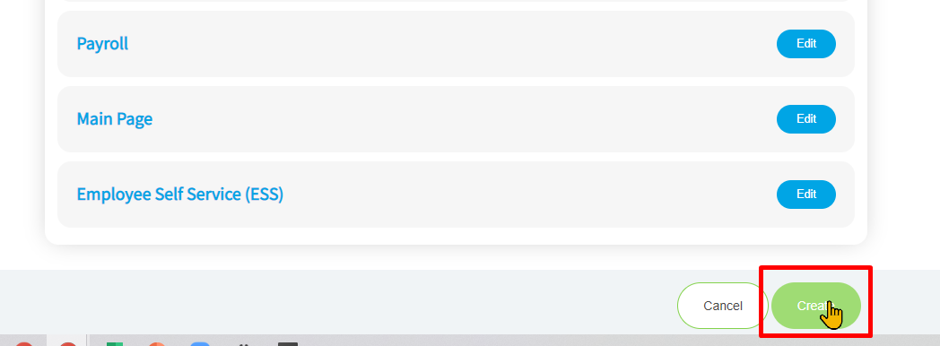 7. Click on Create to finalize user role permissions.